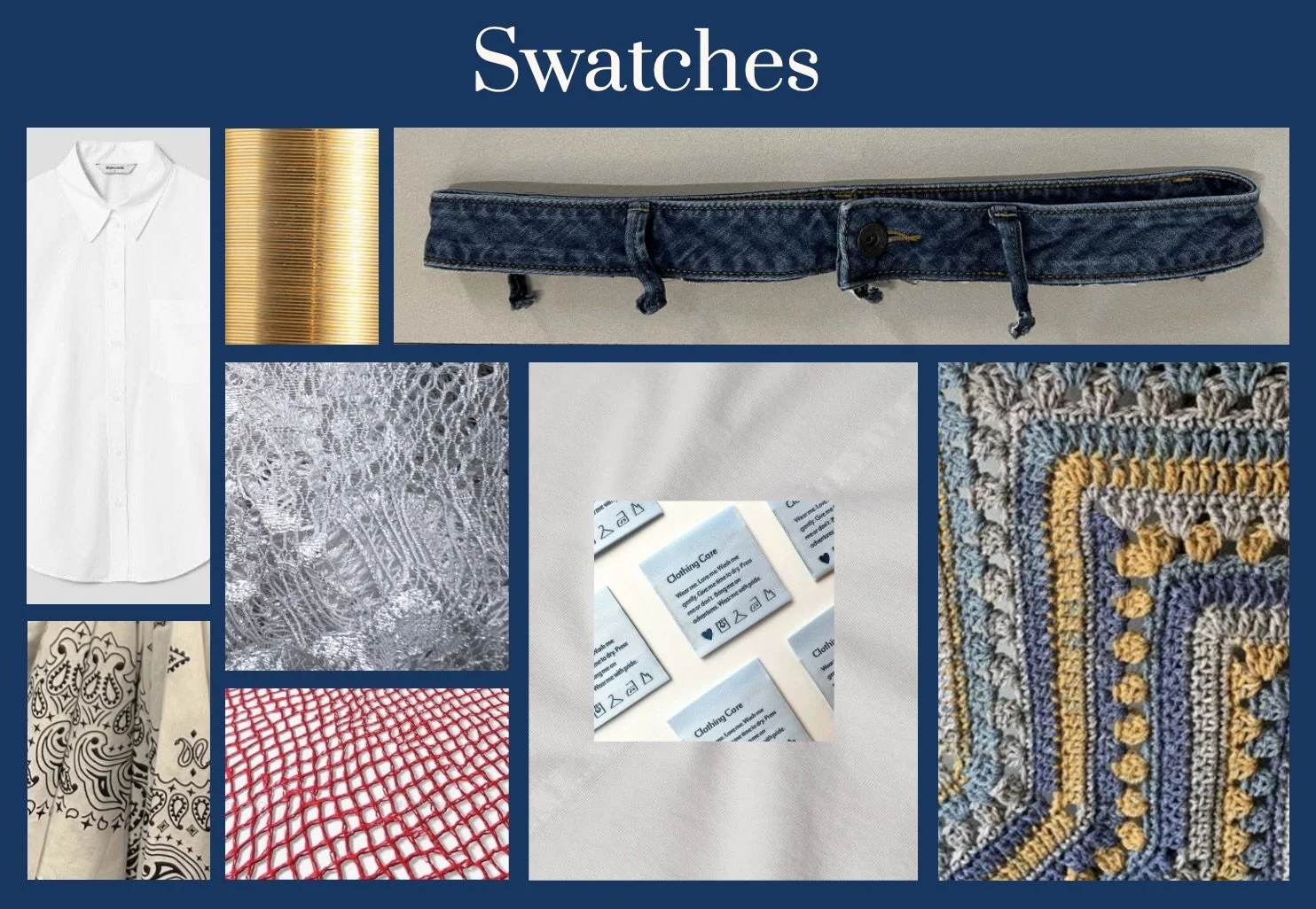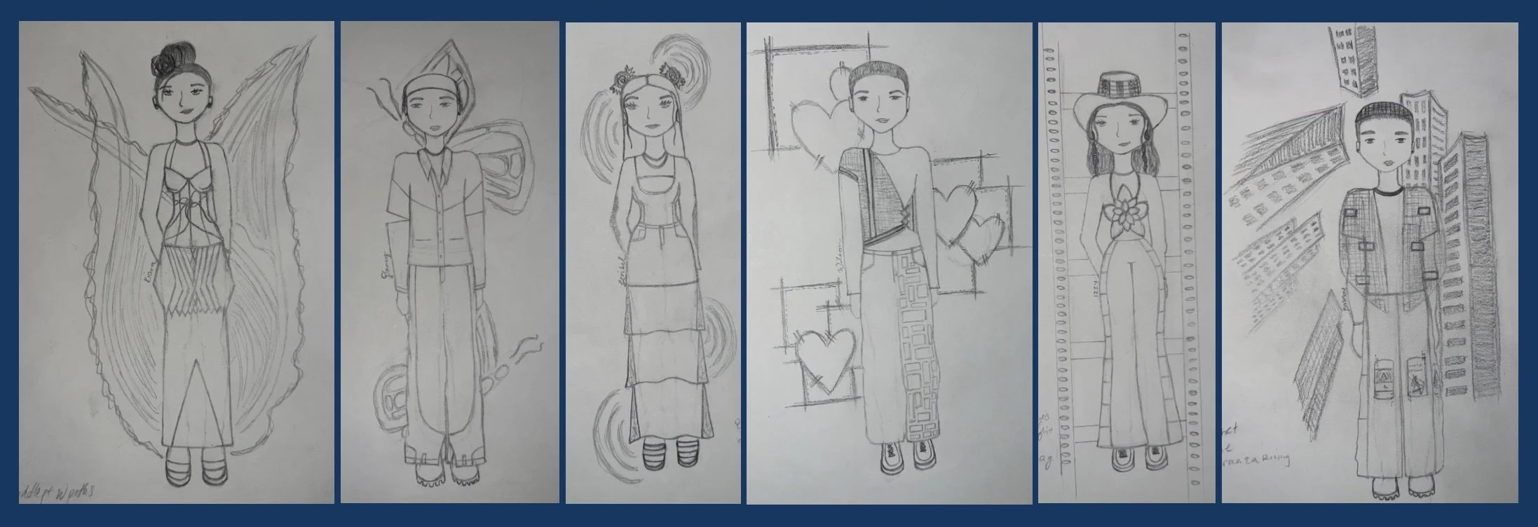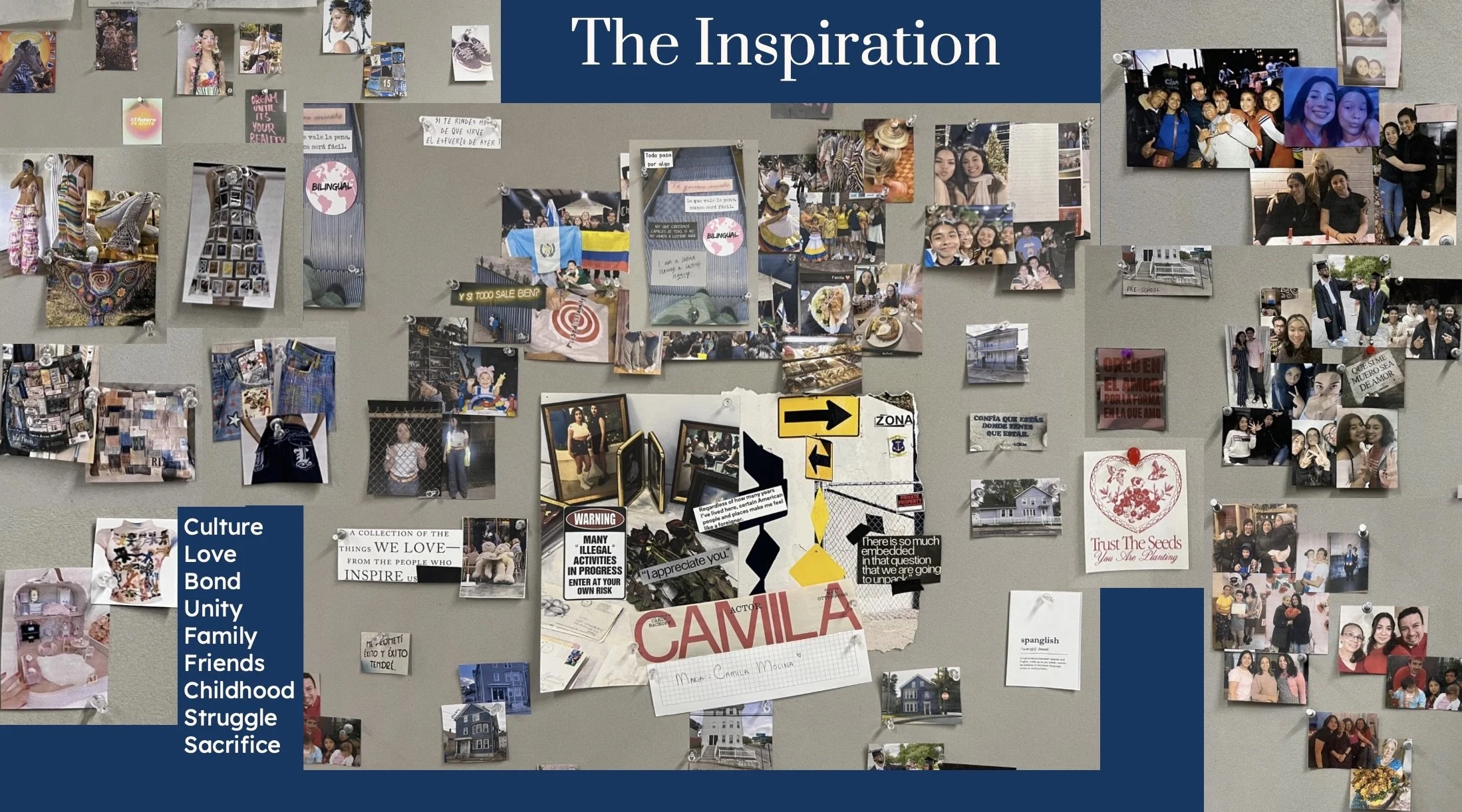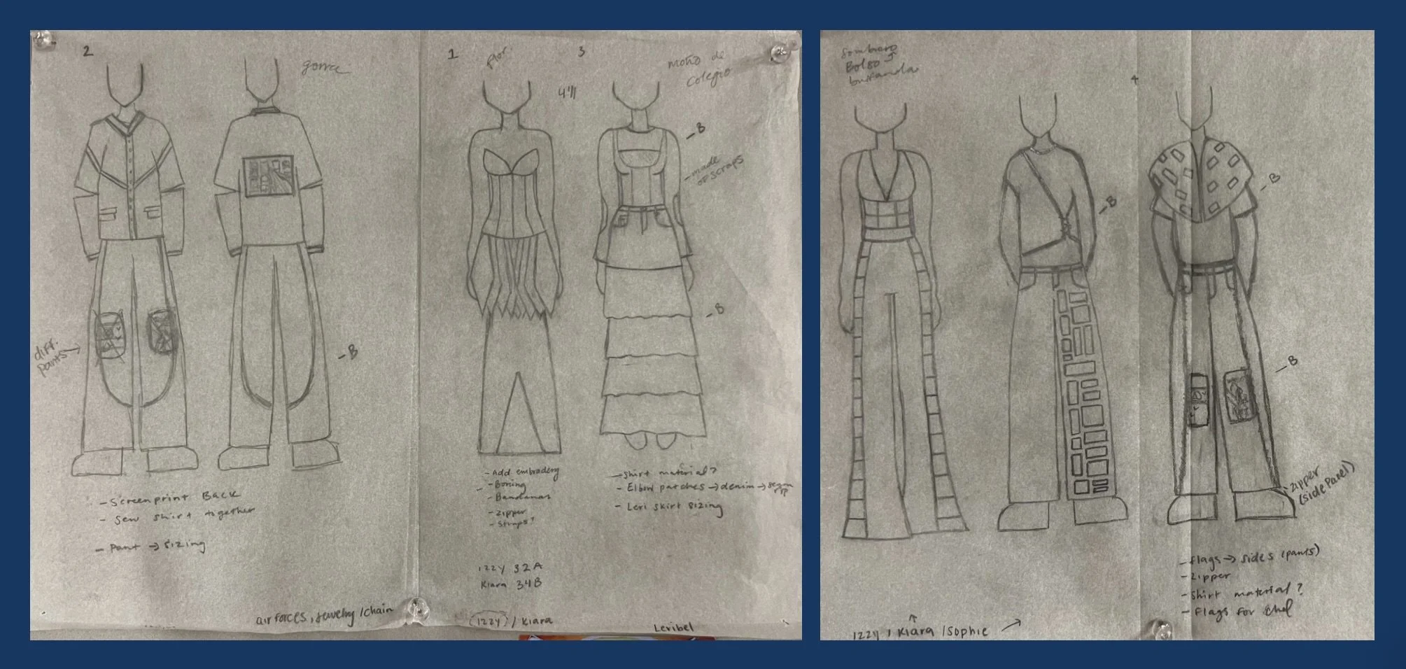 This collection primarily consists of different shades of blue and white with colors like yellow, red, and green being accents. Growing up with a Colombian mother and Salvadorean father in a mixed Hispanic family and a diverse community; my collection honors my people, our way of life, and our hardworking mannerisms. It consists of upcycled denim, unconventional materials, and techniques like crochet to show that, even with limited resources, we still find ways to be creative. The overall silhouettes are inspired by tradition, stereotypes, and our attitude toward looking presentable no matter the circumstances.